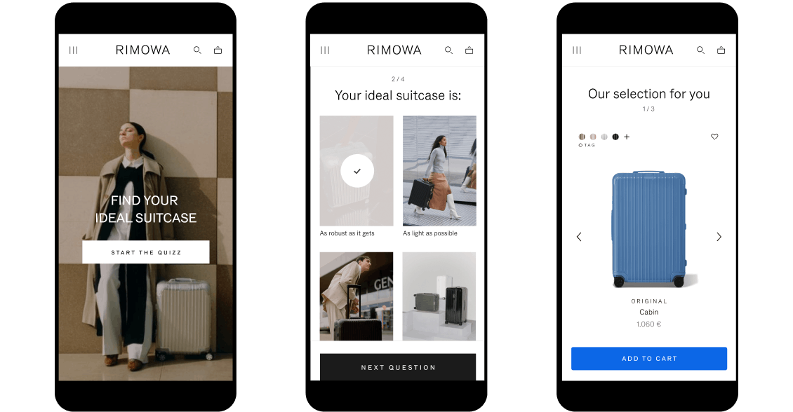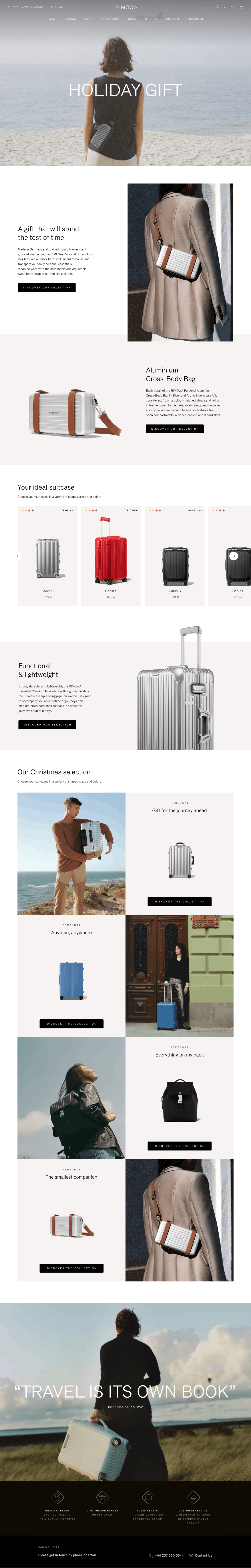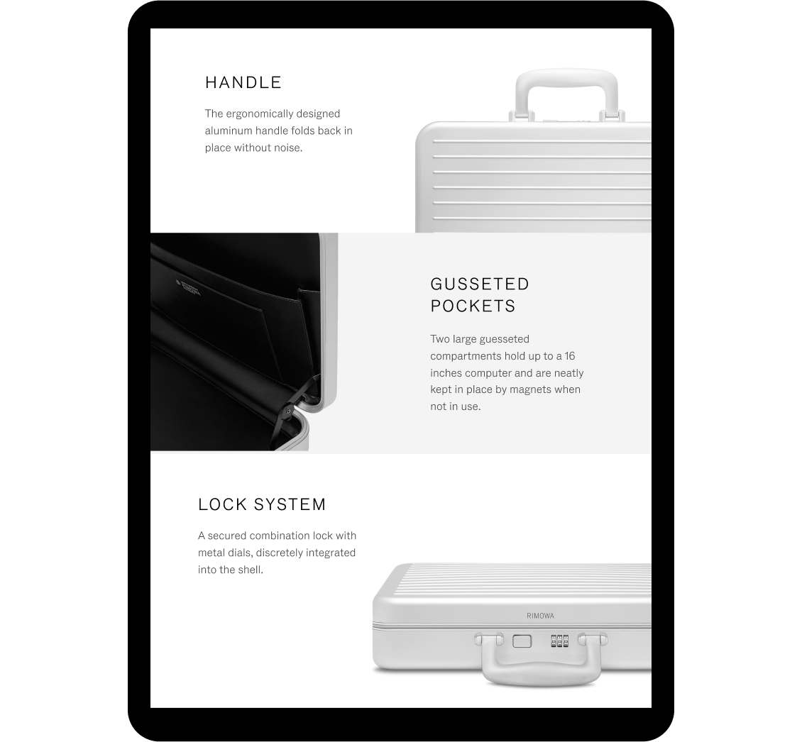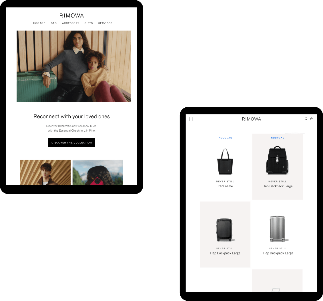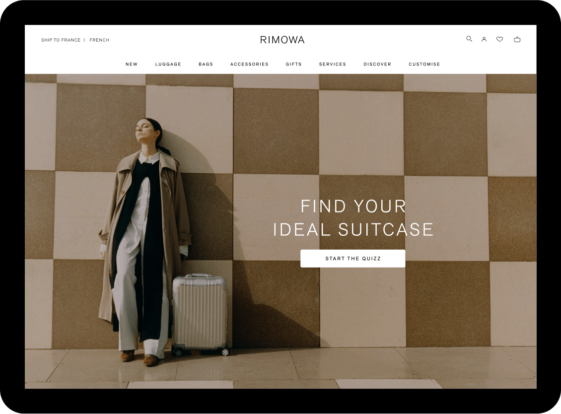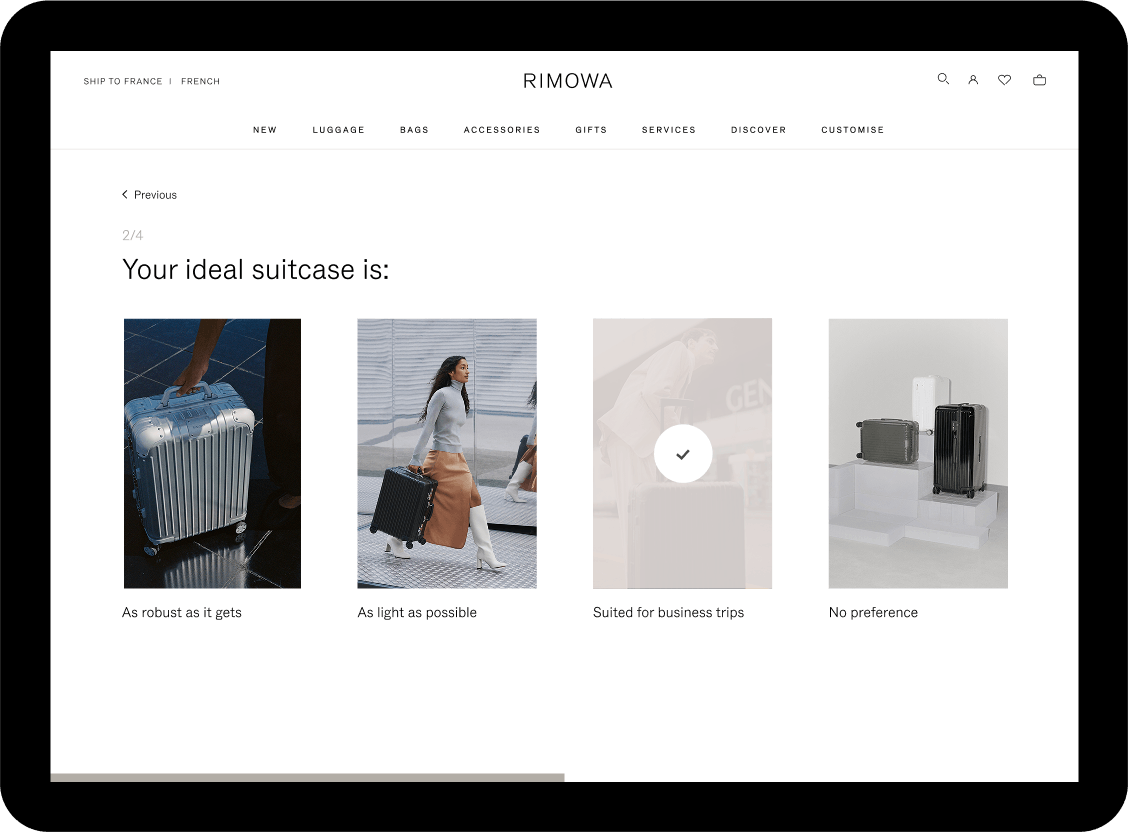 UI/UX Design for a series of tools and landing pages for RIMOWA, the famous luxury luggage manufacturer. We made a series of various researches together around the conception of a product finder, forms, and landing pages for special events, mailings, etc.